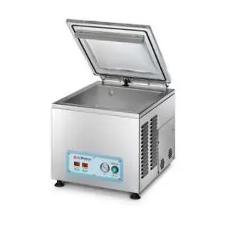 Empacadora al vacío con área de empaque de 30 cm x 30 cm x 4.5 cm de alto. Construida en acero inoxidable. Corriente: 110V / 60 Hz. Medidas: Ancho: 43 cm; Profundo: 36 cm; Alto: 40 cm.