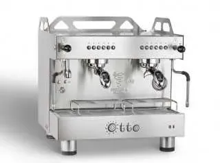 Máquina de café de dos grupos electrónica. Caldera de 8 litros en cobre con 2 vaporizadores. Corriente 110 V, 60 Hz. Medidas: ancho 57 cm; alto 47 cm; profundo 50 cm.